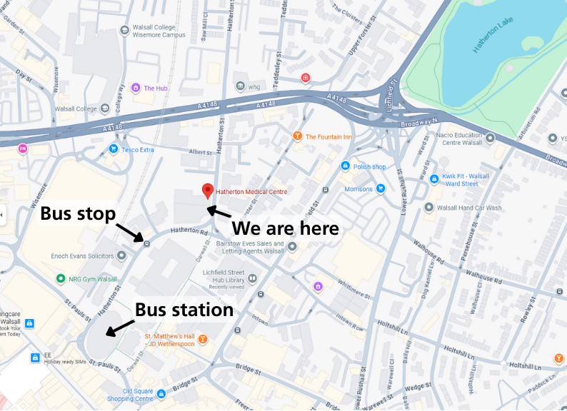 - The bus station is a 4 minute walk from the surgery, please click here to see the available busses.